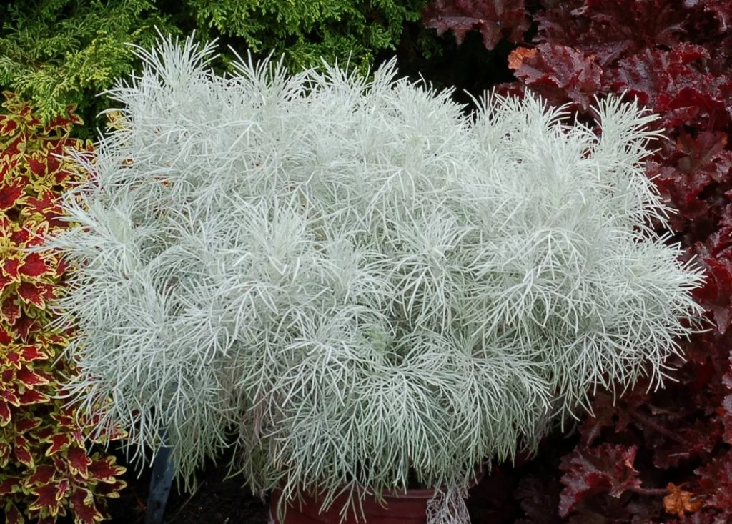 Artemisia Sea Salt – This silver foliage accent plant has soft texture and a semi-trailing habit getting only 8-10″ tall. A great accent plant in containers and window boxes with a nice pop of silvery-white foliage.